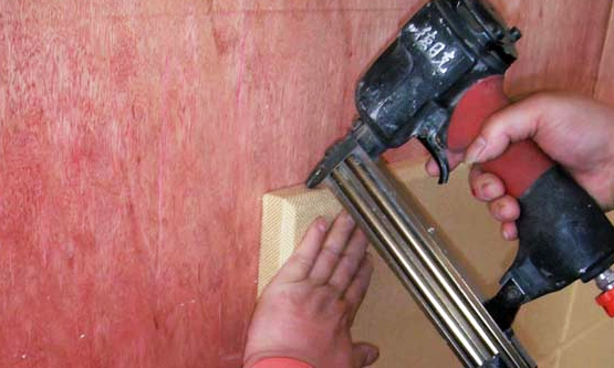 貼幾個點(diǎn),將板平貼在石膏板上,用打釘器將釘固定在吸音板開榫處,吸聲板之間用插