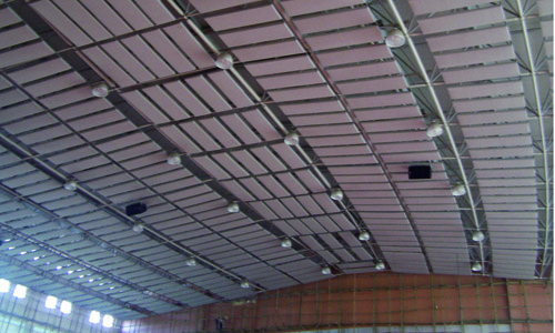 3、吸聲體安裝:吸聲體安裝在懸掛件安裝焊接就位后,用U型環(huán)懸掛,馬道上的吸聲體用鐵絲綁扎,要求排列有規(guī)律,與水平面垂直,整體美觀。吸聲體安裝時要防止尖銳器具刺破,影響吸音及美觀效果。